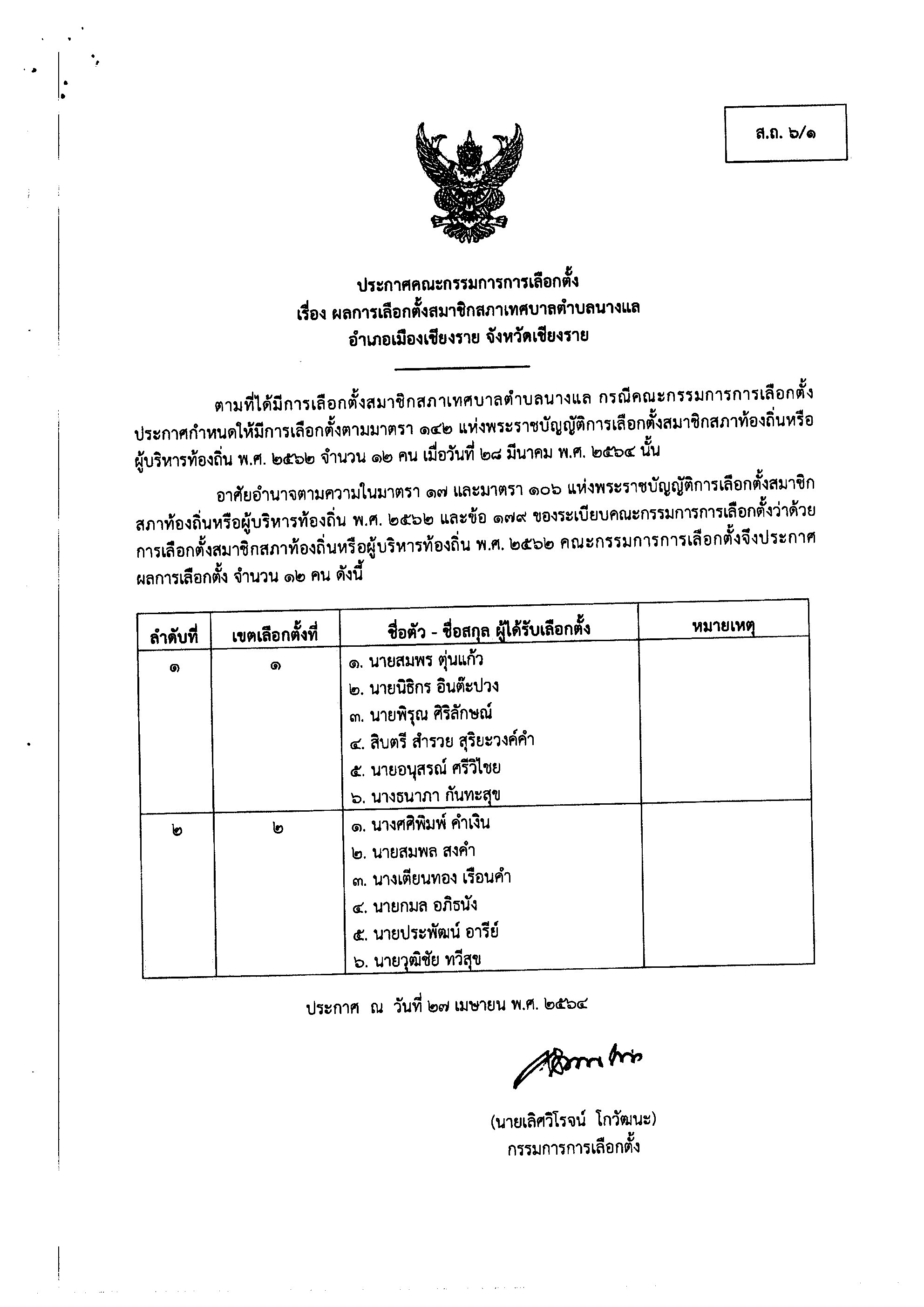 ประชาสัมพันธ์ ประกาศคณะกรรมการการเลือกตั้ง เรื่องผลการเลือกตั้งสมาชิกสภาเทศบาลตำบลนางแล